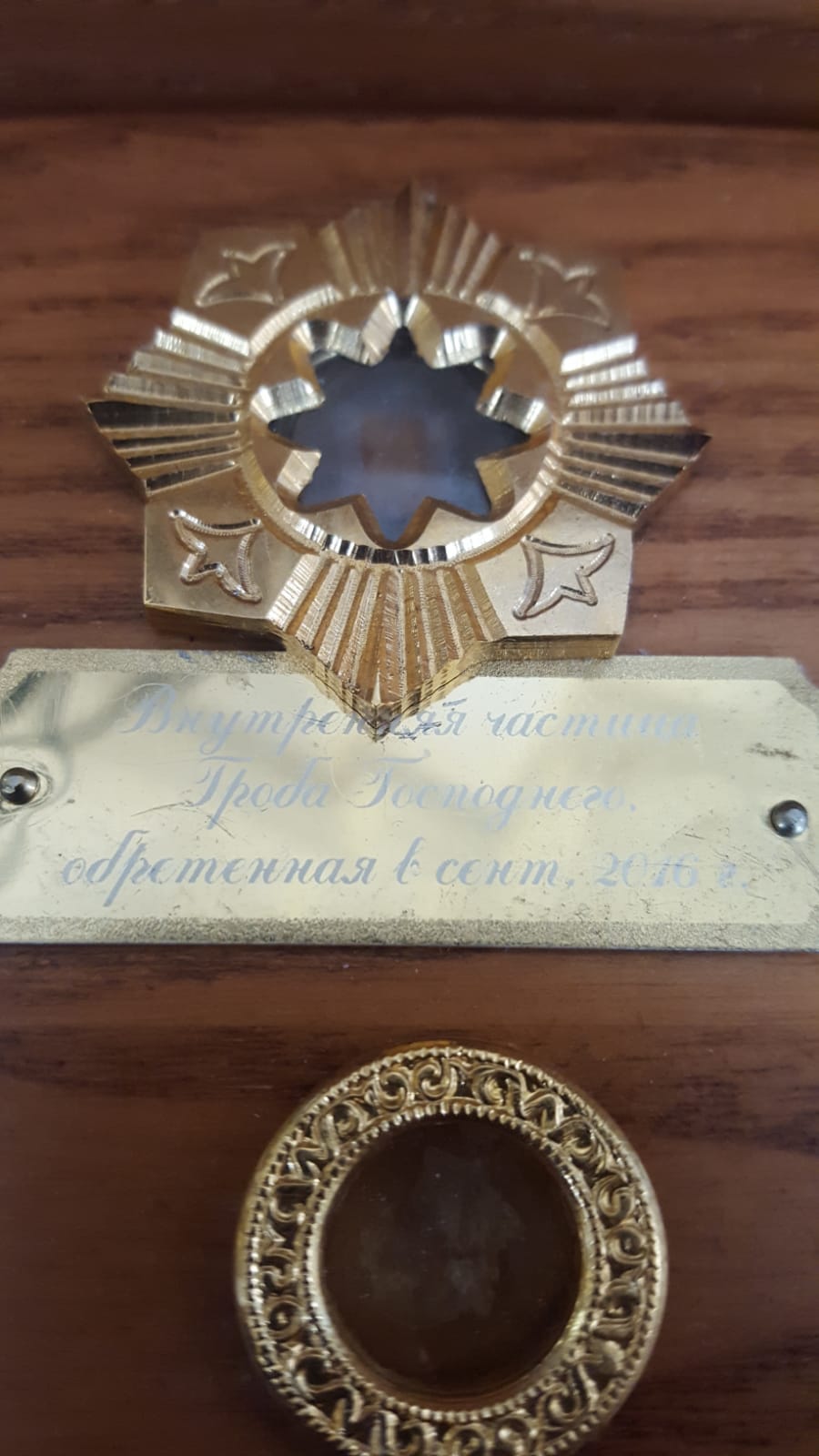 1. Částice kamene Božího hrobu, získaná na podzím roku 2016 v Chrámu Božího hrobu.