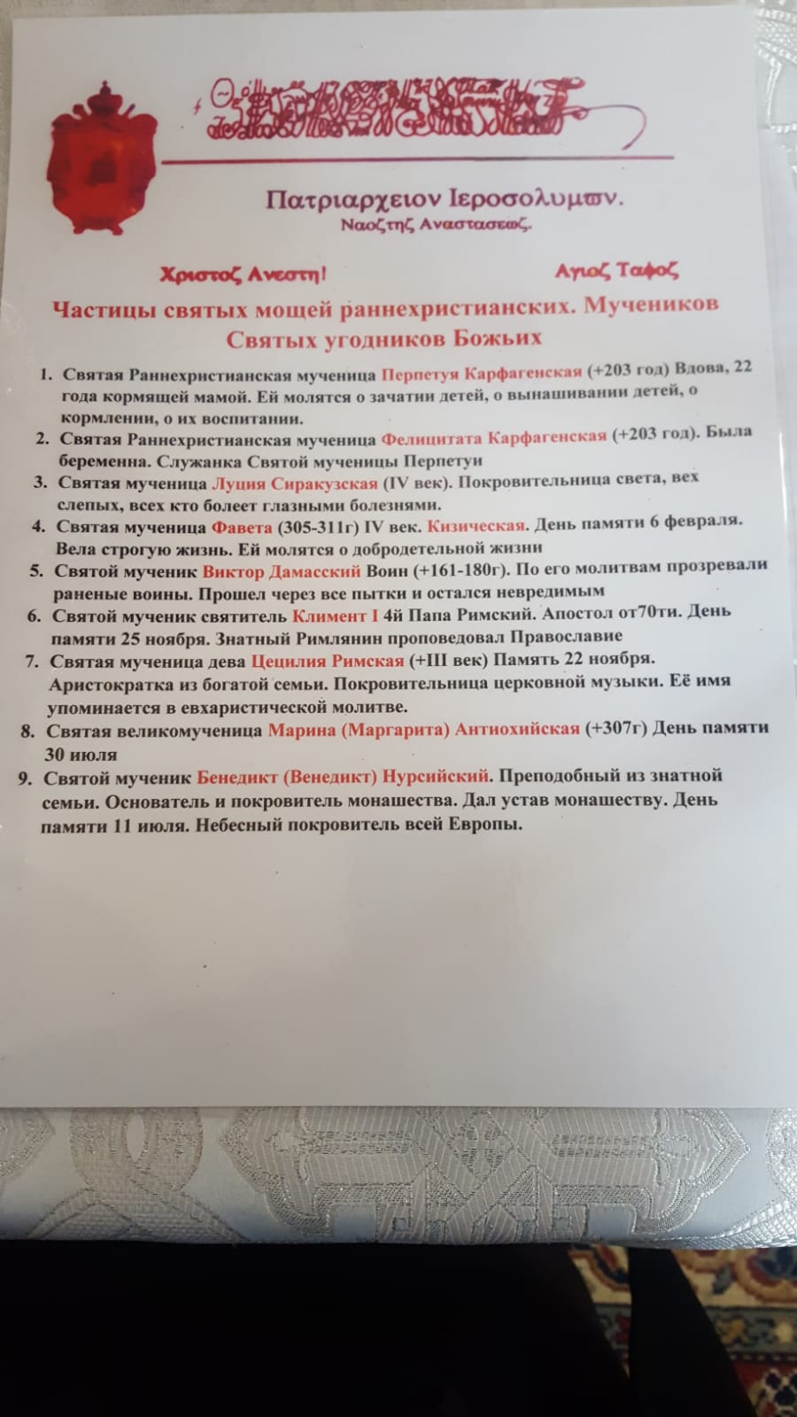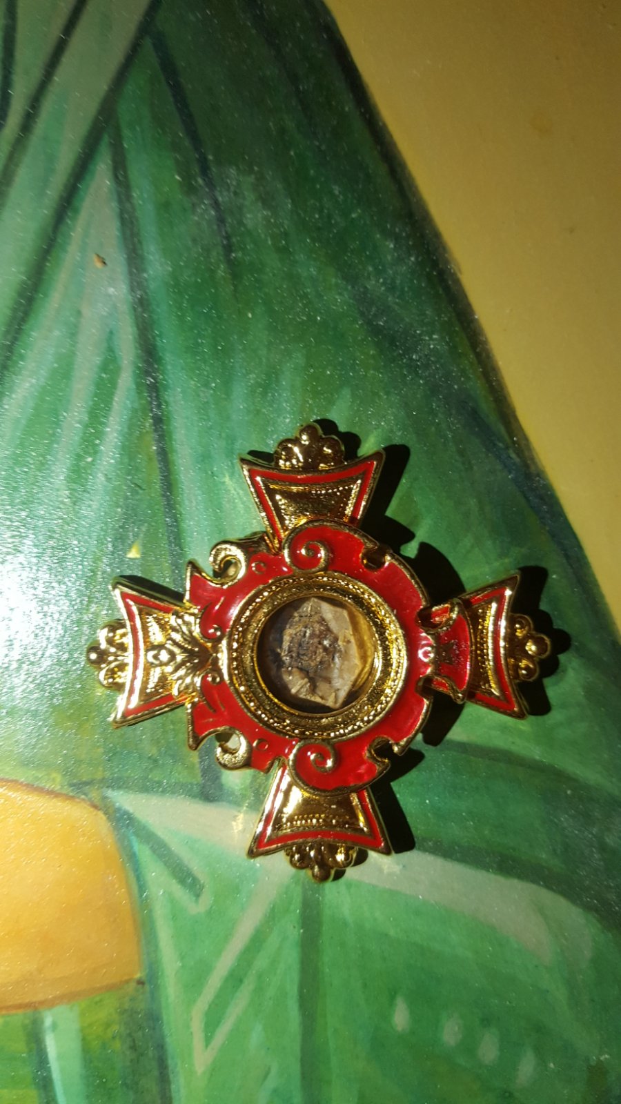 9. Částice přikrývky z hrobu spravedlivého Jana Ruského (+1730), vyznavače.