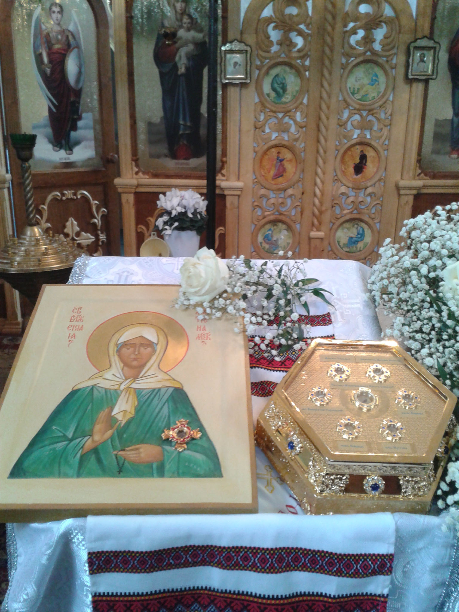 V našem chrámu jsou umístěné tři relikviáře a obraz svaté blažené Matrony Moskevské (+1952) s částicí její relikvie (památka 2. května (19. dubna))